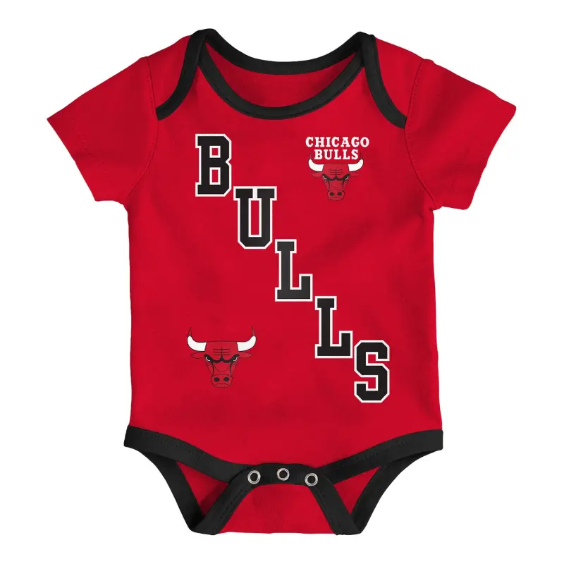 Start them young with this adorable 3-pack of Chicago Bulls infant onesies from Outerstuff. Made from 100% soft cotton, each bodysuit features a unique color and its own Bulls-inspired text design, bringing variety and team spirit to your little fan’s wardrobe. With lap shoulders and snap bottoms for easy changes, these onesies are as practical as they are playful—perfect for game day, nap time, or playtime.