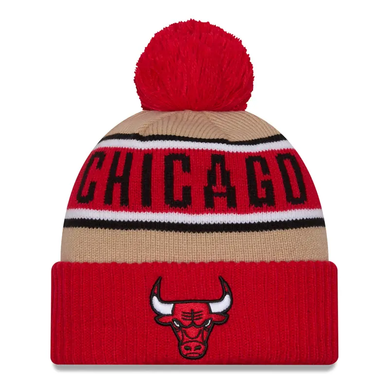 Home / Shop / Chicago Bulls / Men’s Chicago Bulls New Era Red/Tan 2024 NBA Draft Cuffed Knit Hat with Pom